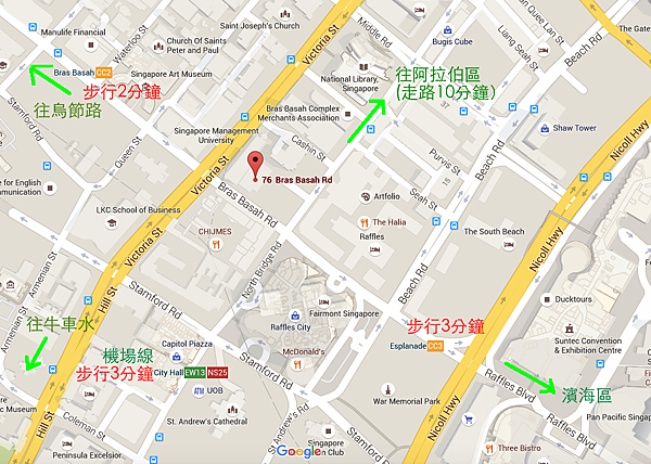 至於交通方面,最近的站是Circle Line的CC2 Bras Basah (百勝),差不多是各主要景點的中心位置,搭乘捷運往小印度、烏節路、濱海灣、牛車水大概都在五站內就可以到。