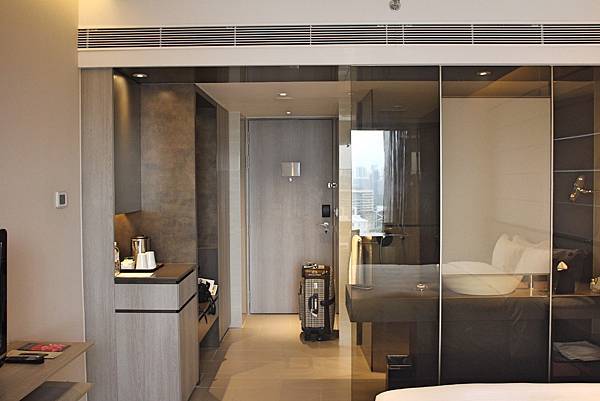 走道很寬。面對門口,左邊是茶水臺(冰箱在下面櫃子)、行李臺、衣櫥。右邊則是浴室、廁所、洗臉臺。