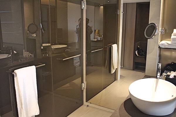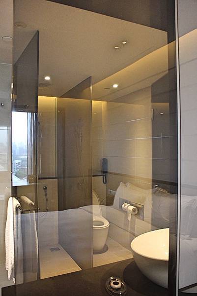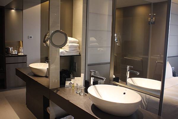 洗臉台是開放式的。背後兩扇玻璃門,左邊是浴室,右邊是廁所。