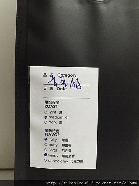 包裝袋後貼有這支豆子的特色。中烘培具有果香及葡萄酒香。