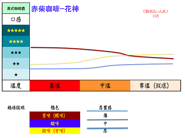 剛沖好時,會覺得醇味很厚實,甜度和酸度比較平淨安定,隨著溫度降低後,會覺得三個味道慢慢合攏在一起。