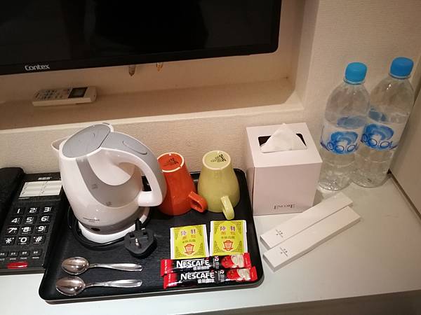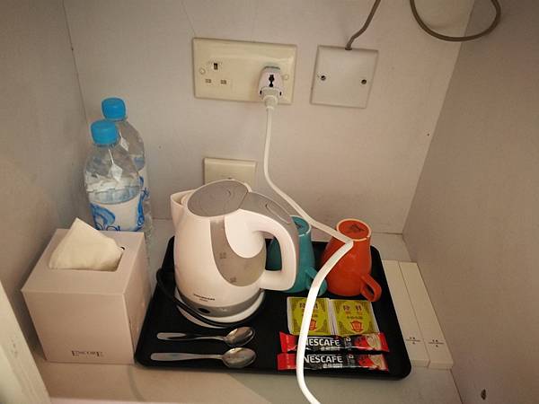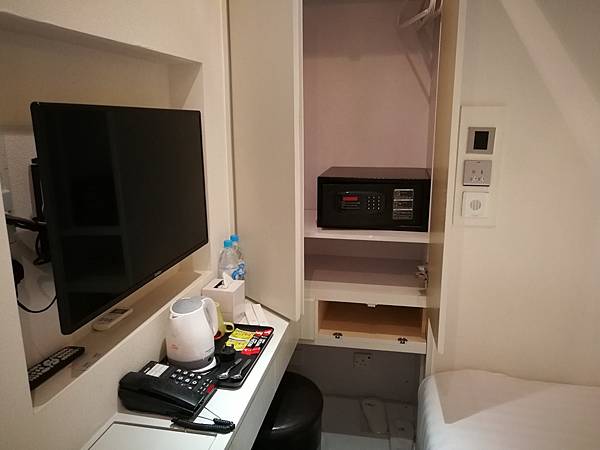 床頭旁有個小櫃子?是的,這也是房間裡面唯一個櫃子,茶水、保險箱都在這裡。