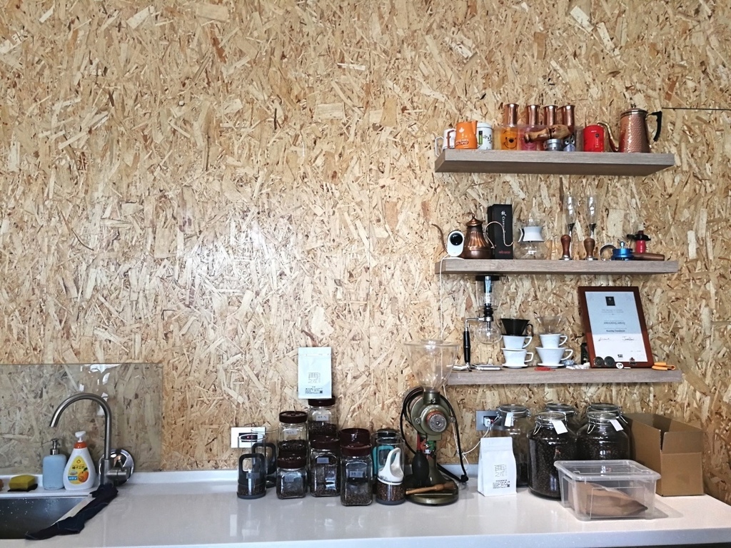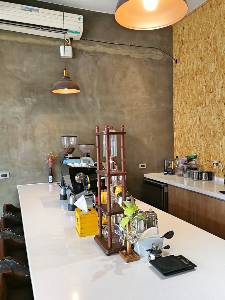 店面寬,空間中等,大概就比一般家庭客廳寬一些,裡面是工作檯,前方是超大面的中島式料理檯加吧桌,可以坐在這裡品味磨豆機破豆的清脆爽朗的聲音,也可以聞著咖啡粉的乾香。