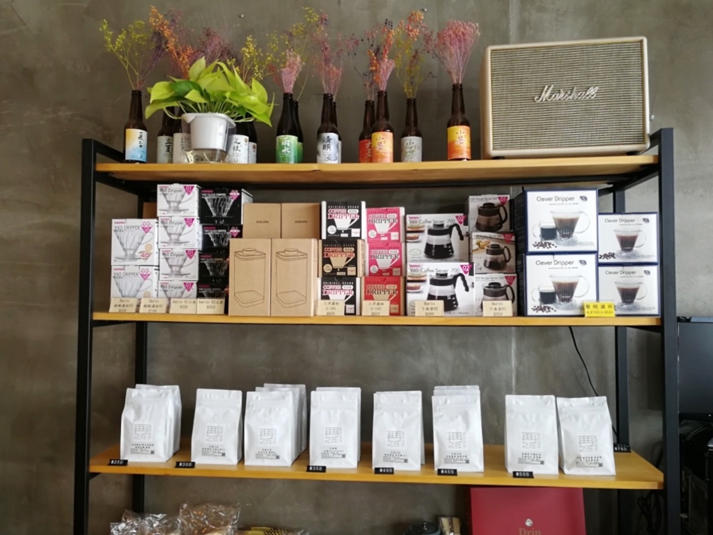 烘豆機旁的架上陳列的可以直接銷售的產品,除了自家烘焙的咖啡豆,主要是各種咖啡手沖工具。