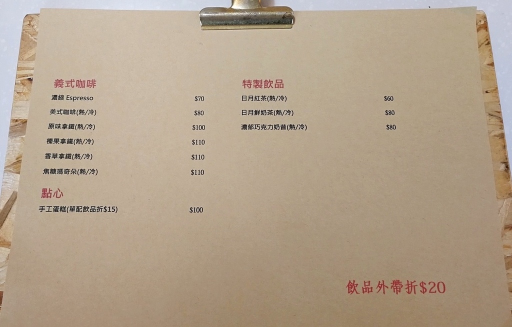 再再之在的菜單,簡單兩頁,單品咖啡從淺焙到深焙都有,價位在120-180之間,以手沖咖啡而言,價位中等。