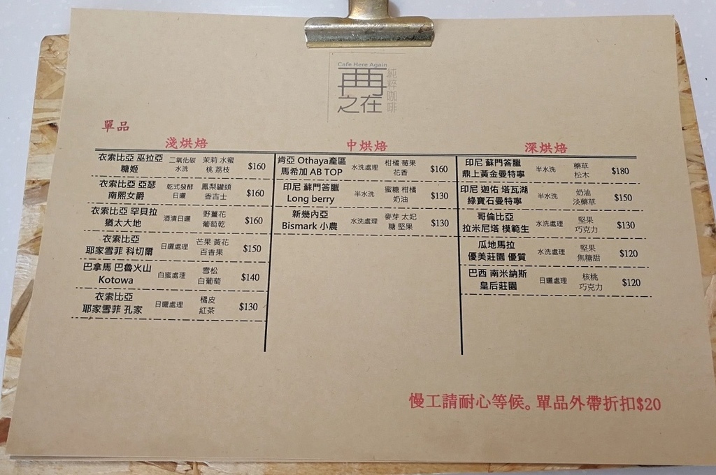 單品前三支衣索比亞豆子,竟然都是沒試過的。老闆喜歡微批量的豆子,很多豆子也是賣完就沒了,想知道最新的咖啡豆的朋友,可以關注再再之在的粉絲專頁。