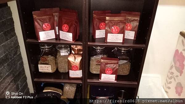 所以,在烘豆機旁的牆面架上,也擺放著袋裝咖啡豆。