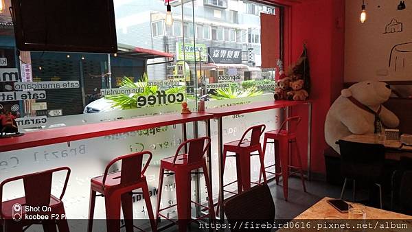 窗檯吧桌一樣是大紅色調。旁邊牆角有隻北極熊布偶。