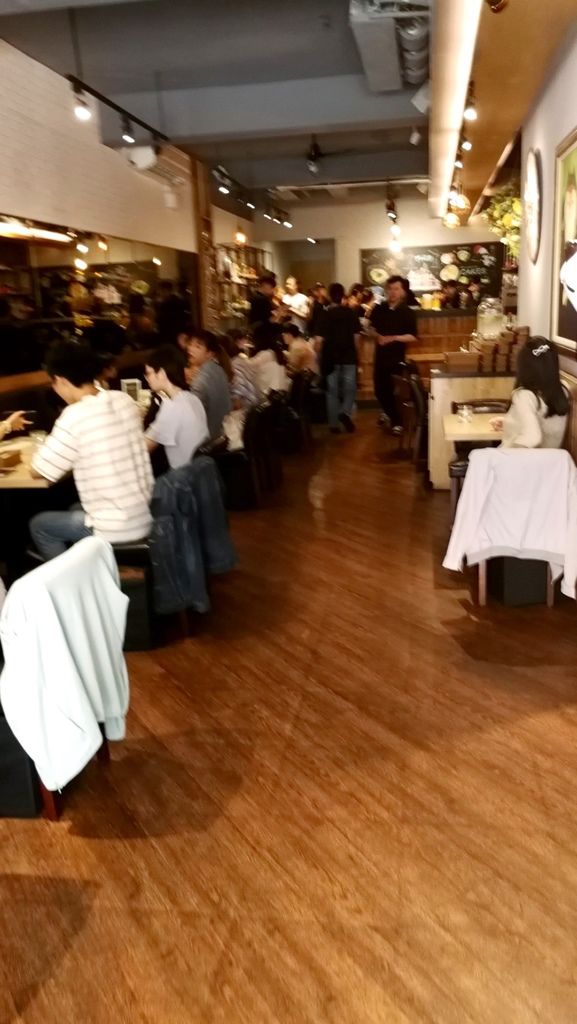 瞎咪!好咖假日11:30開始營業,我11:40前就到了,一樓已經客滿了!一時嚇到手抖拍照都糊了,也好,省掉幫客人臉打馬賽克的工。