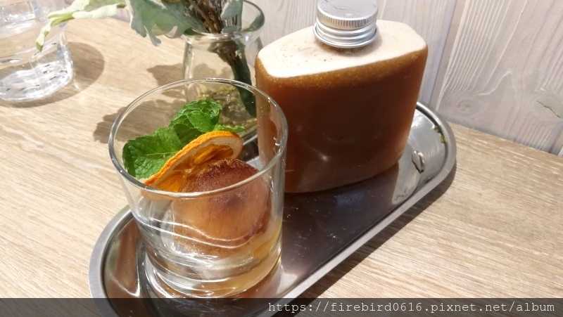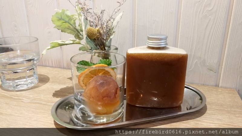 旁邊杯子底部放入球形的冰塊,上面應該也是有柳橙的味道,再加上一片香橙乾片。
