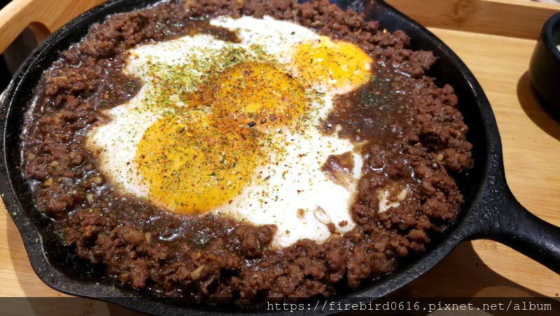 個人猜想應該是先用鑄鐵鍋把肉醬煮熱,再加飯在中間,並打上三顆雞蛋後,再進烤箱用悶一下。