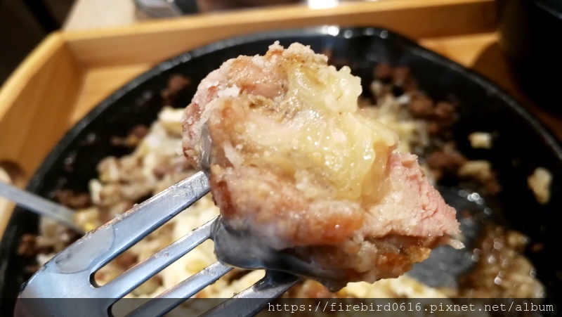Zoom in看一下,這炸雞一點都不肥,外面的粉薄薄的,雖然量和一般炸雞塊定食差不多,但是少了一般炸雞外皮厚厚的粉,肉量顯然多不少。