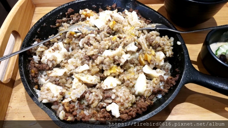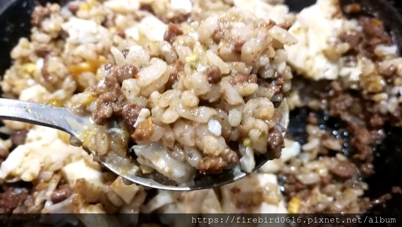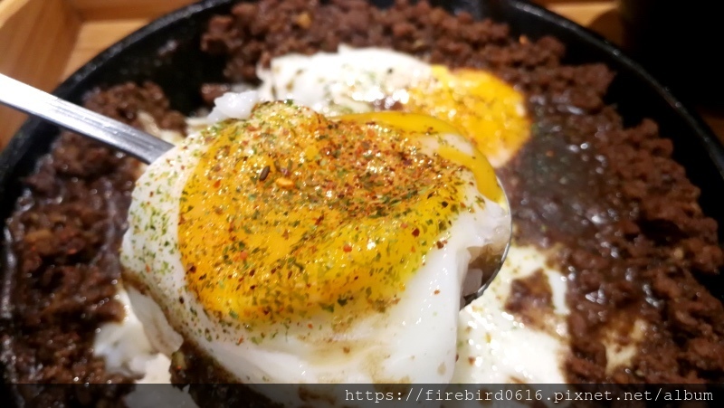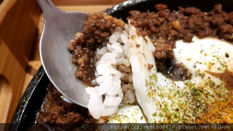 但是把蛋攪碎和和肉肉醬mix在一起後,飯吸附了蛋汁、牛肉香氣,混合在一起後就完全不會乾。