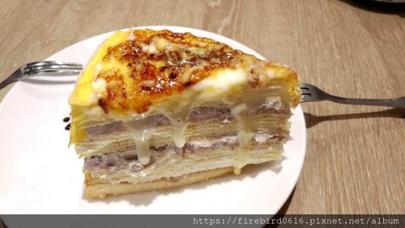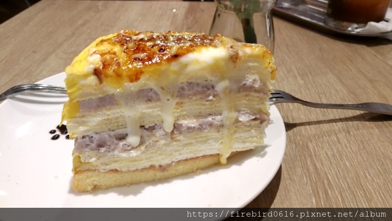 從側面就可以看出這千層的結構,中間有兩層芋泥,顆粒不小不會過甜,上層的奶油像熔岩飛瀑流下,混在一起吃味道不錯。